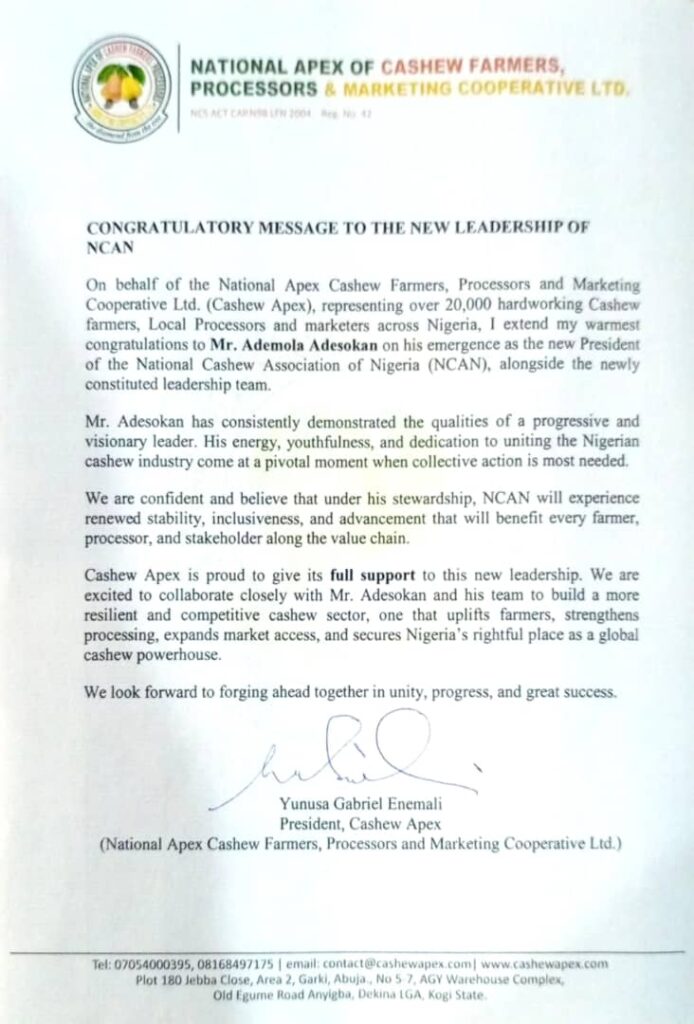 In a official statement signed by the President, Cashew Apex Mr Yunusa Gabriel Emenali said “On behalf of the national Apex Cashew farmers processors and marketers cooperative Ltd, (Cashew Apex) representing over 200,00 hard working Cashew farmers, local processors and marketers across Nigeria, extend our warmest congratulations to Mr Ademola Adesokan on his emergence as the new Interim President of NCAN alongside the newly constituted leadership team”