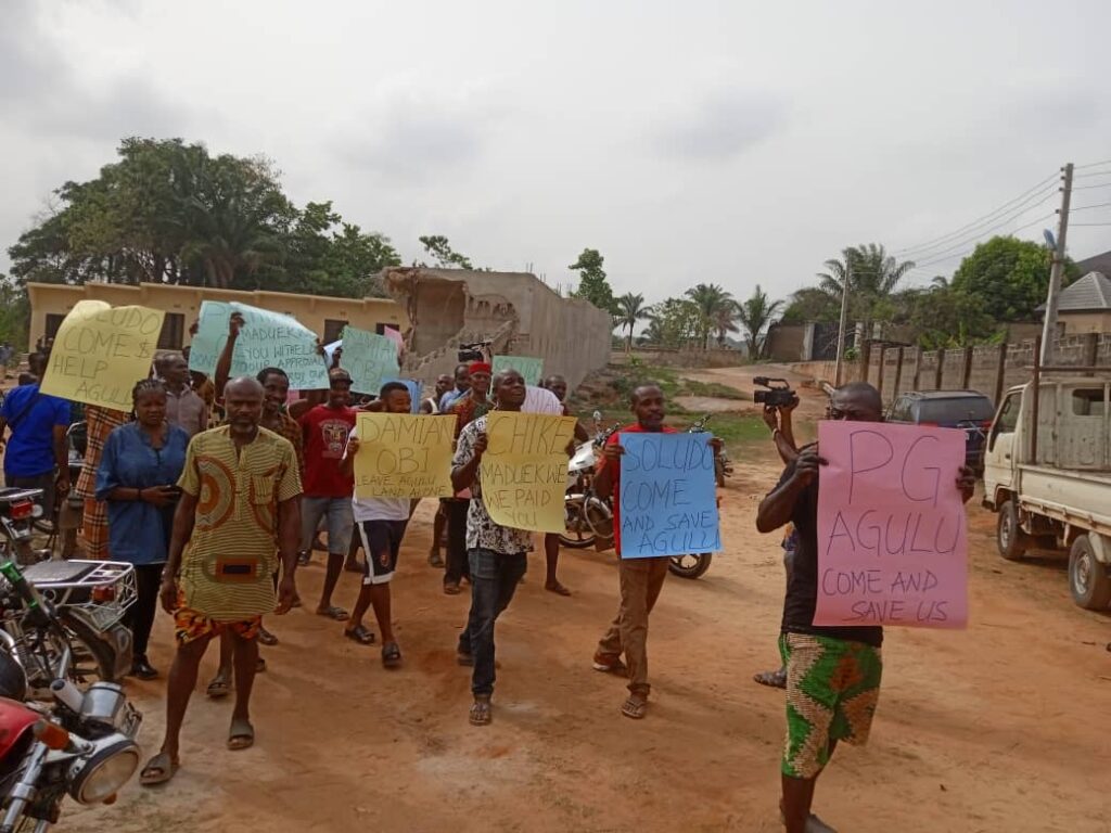 The protesters marched across the market axis displaying placards with various inscriptions as “Soludo help shop owners”, “Peter Obi help us”, “Shop Owners are dying,” “Soludo come and save Agulu people”, among others.