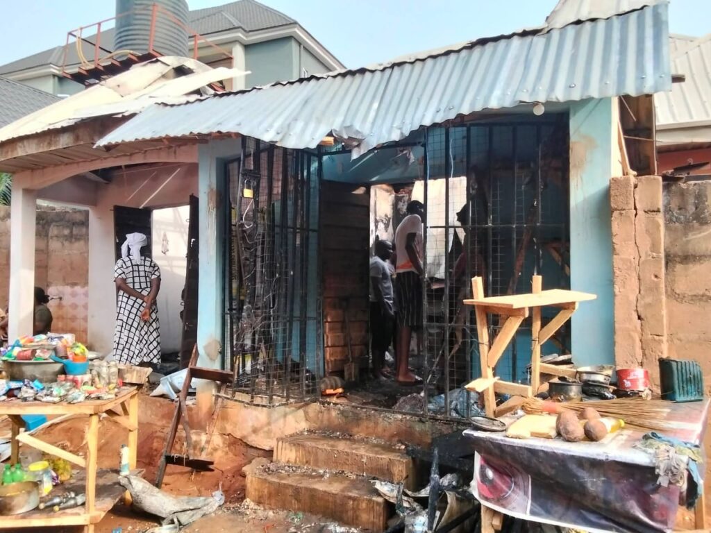 The owner of the laundry shop, Mr John Vincent whose wife put to bed recently, regretted that his customers’ clothes in the shop were burnt to ashes though his washing machine and generator were rescued by neighbours before he could get to the scene.